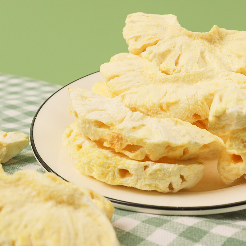 新鮮菠蘿,采用FD工藝制成菠蘿脆,鎖住新鮮,鎖住美味,使菠蘿脆保持原有的色、香、味、形,原滋原味,酥脆爽口,果香四溢,齒頰留香。